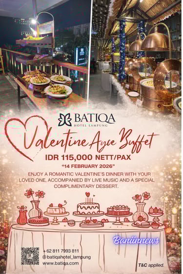Baniinnews - Bandar Lampung (30/01/2026), Menyambut Hari Valentine, BATIQA Hotel Lampung menghadirkan promo spesial Valentine All You Can Eat (AYCE) Buffet Dinner dengan harga terjangkau, yakni Rp115.000 per orang. Promo ini ditujukan bagi siapa saja yang ingin merayakan Hari Kasih Sayang, tak terbatas hanya untuk pasangan.