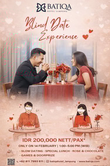 Dalam rangka merayakan Hari Valentine, BATIQA Hotel Lampung menghadirkan konsep acara unik dan berbeda bertajuk Valentine Blind Date, sebuah kegiatan yang terbuka untuk umum dan ditujukan khusus bagi individu yang belum memiliki pasangan. Acara ini akan diselenggarakan pada 14 Februari 2026, pada siang hari pukul 13.00 hingga 17.00 WIB, bertempat di BATIQA Hotel Lampung